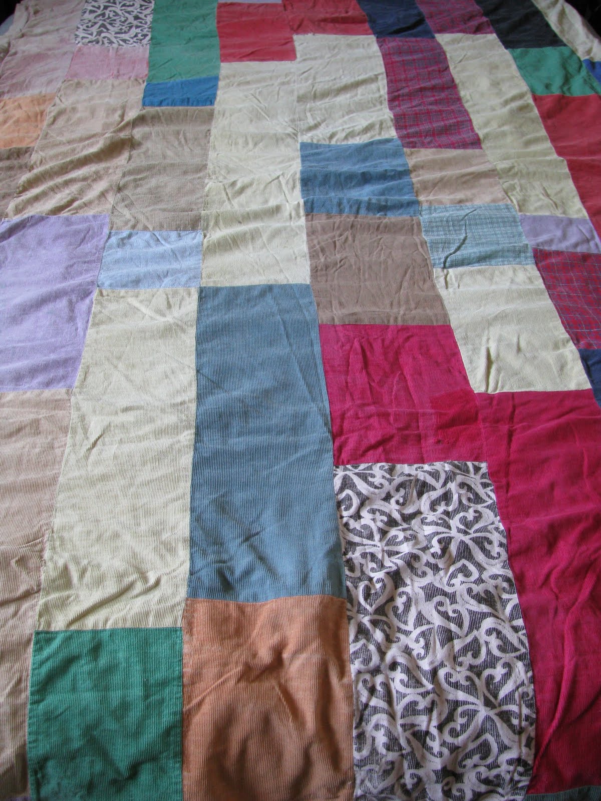 DH was born and raised Up Nort' and this is his boyhood patchwork. I say patchwork, because it isn't quilted or tied, and it has no filling or batting. It is corduroy patchwork on both sides.